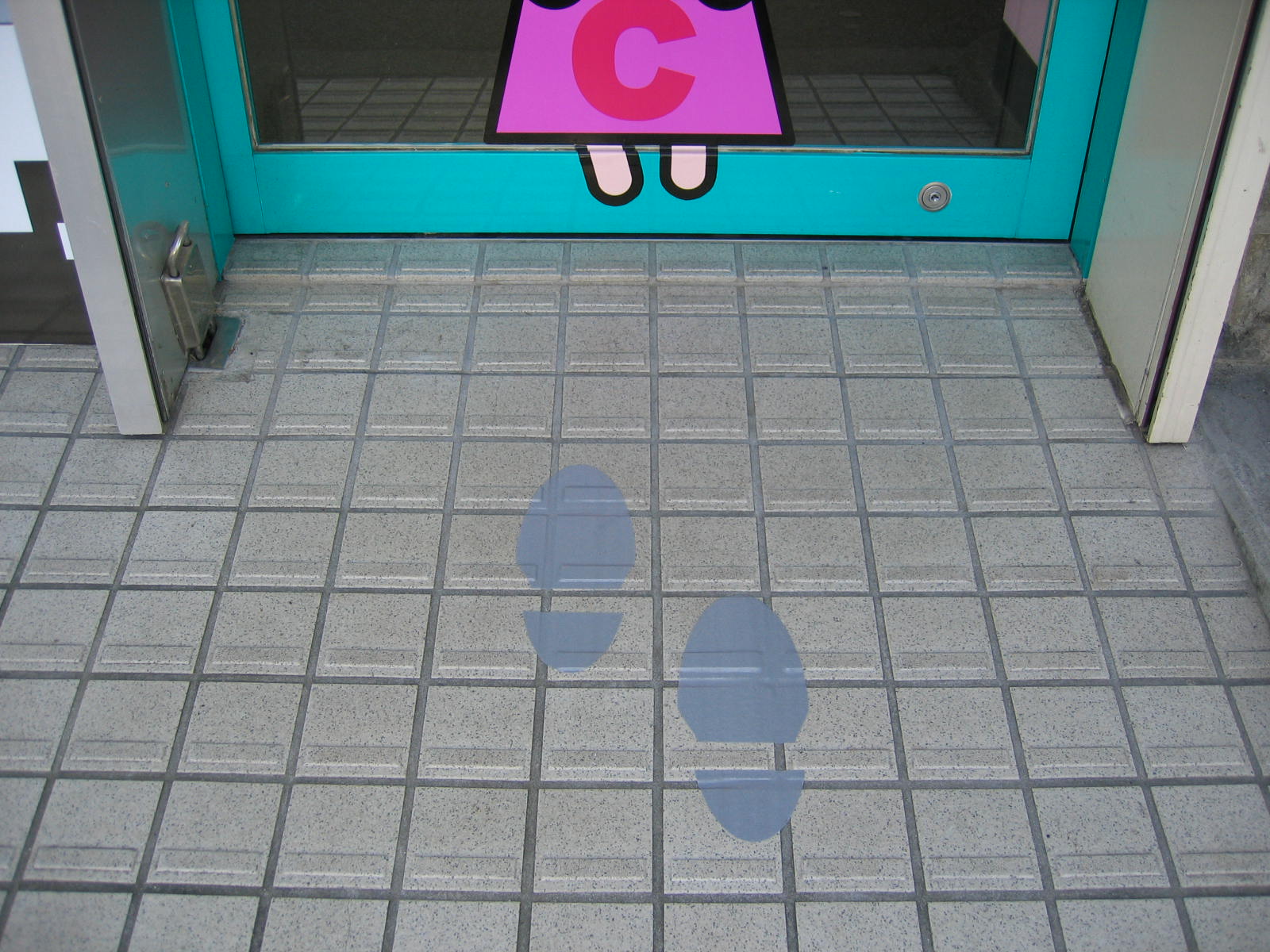 ○キャラクターは自動ドアの縁に腰掛けています。 |