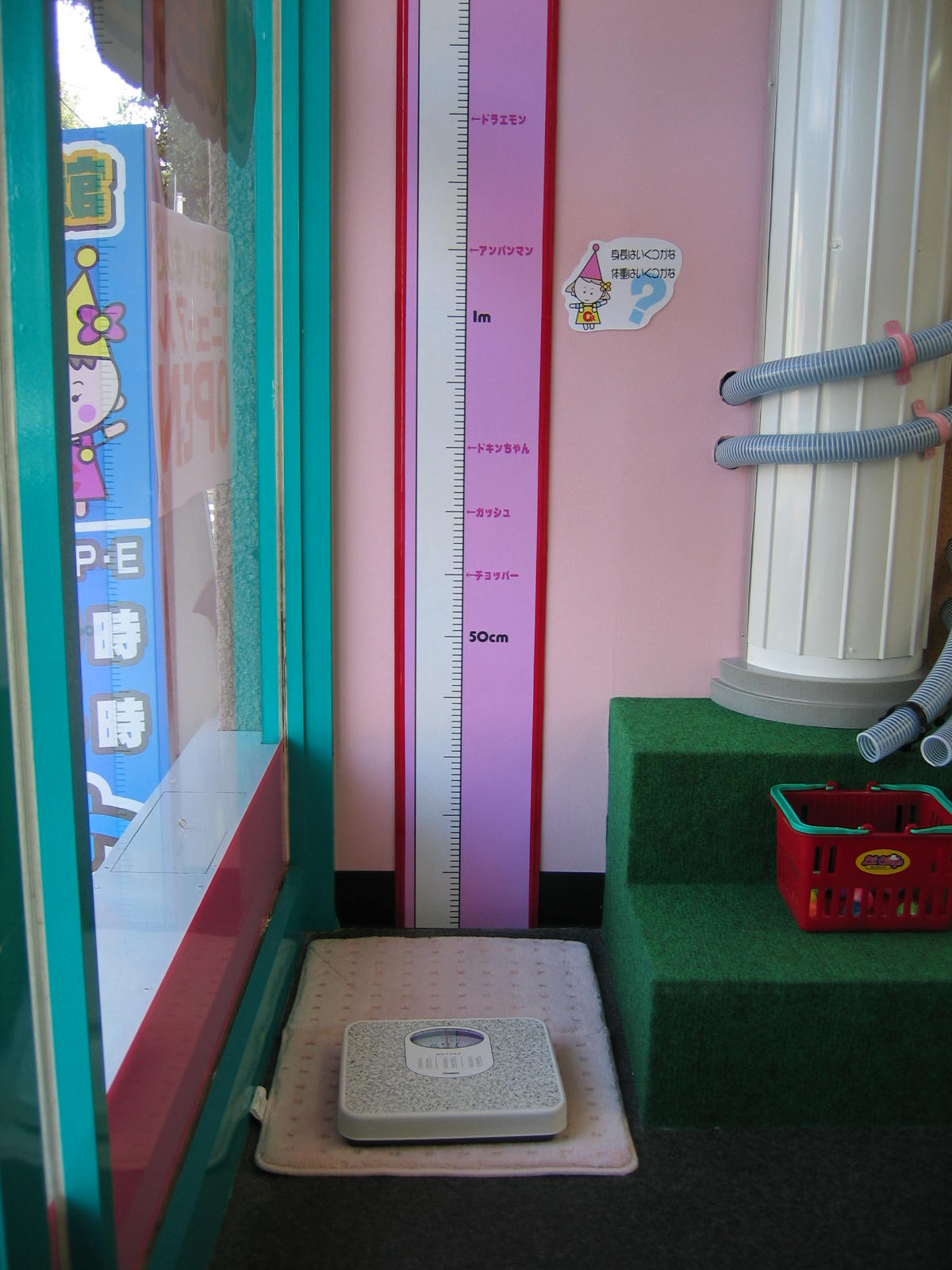 ○ただの身長計では測る楽しみがないため、アニメのキャラクターの身長も入っています。手前には体重計もおいてあります。 |