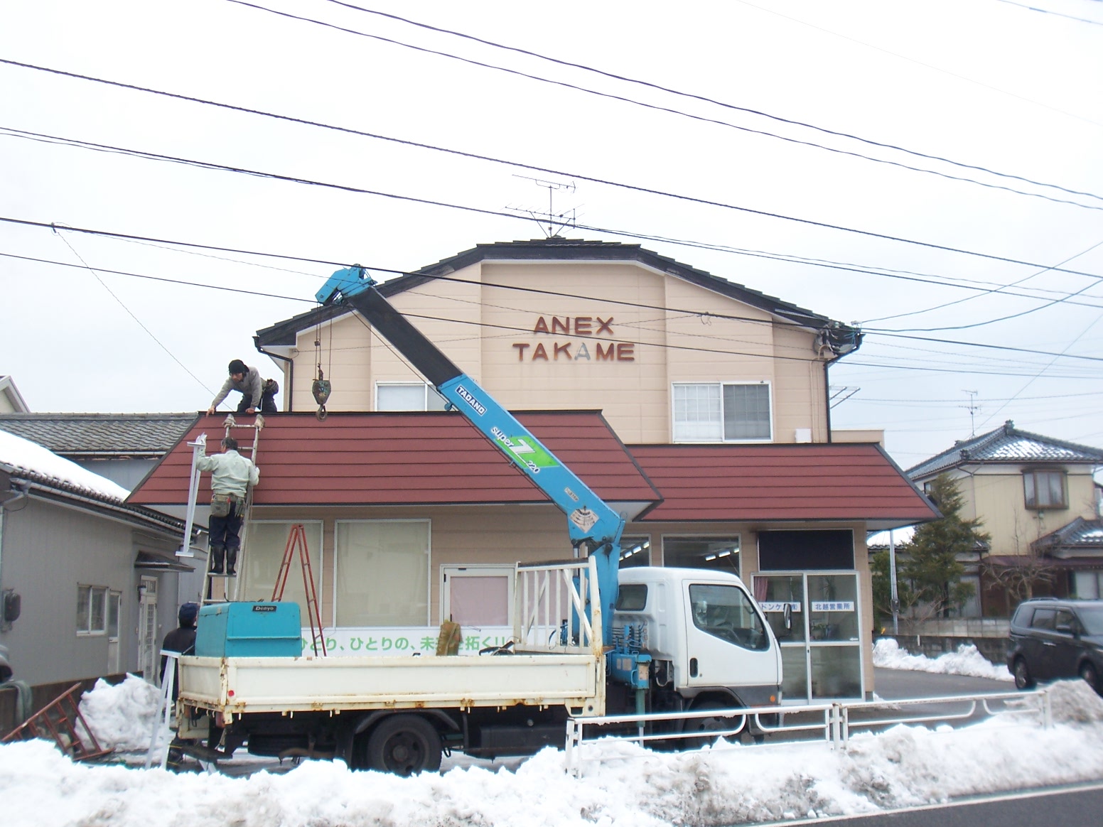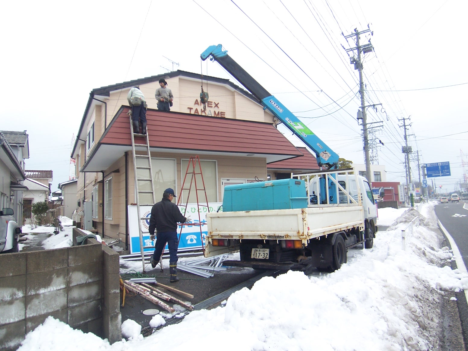 ○高所作業車で既存看板を撤去し、新規看板の取付 |