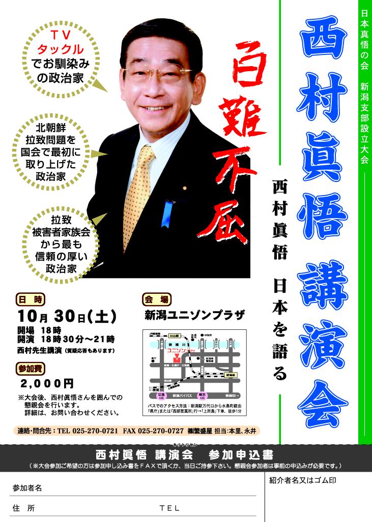ちなみに西村眞悟さんは、本日新潟で講演会、明日の31日は大阪で講演会、翌11月1日に再度新潟に入られまして、中越地震による被災地を巡視される予定となっております。
