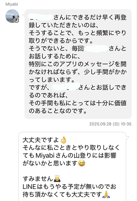 例えば今回みたいにヤマップのメッセージでのやり取りであればIDが削除されたらやり取りが出来なくなる。