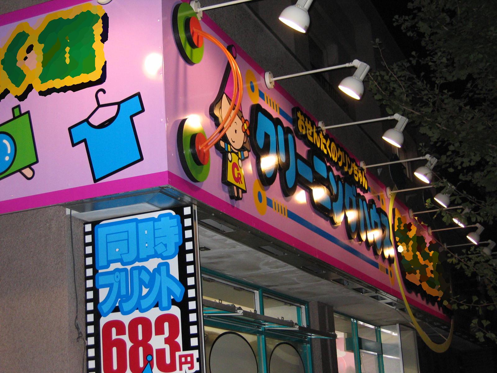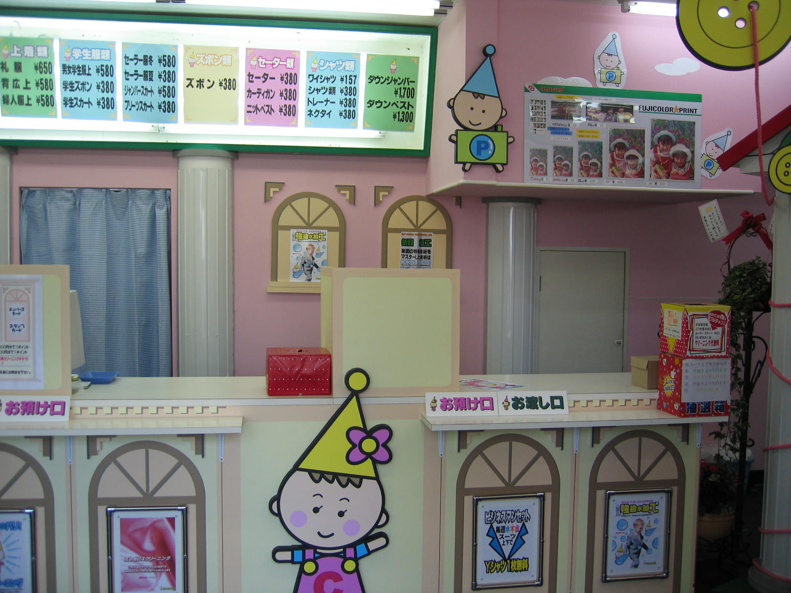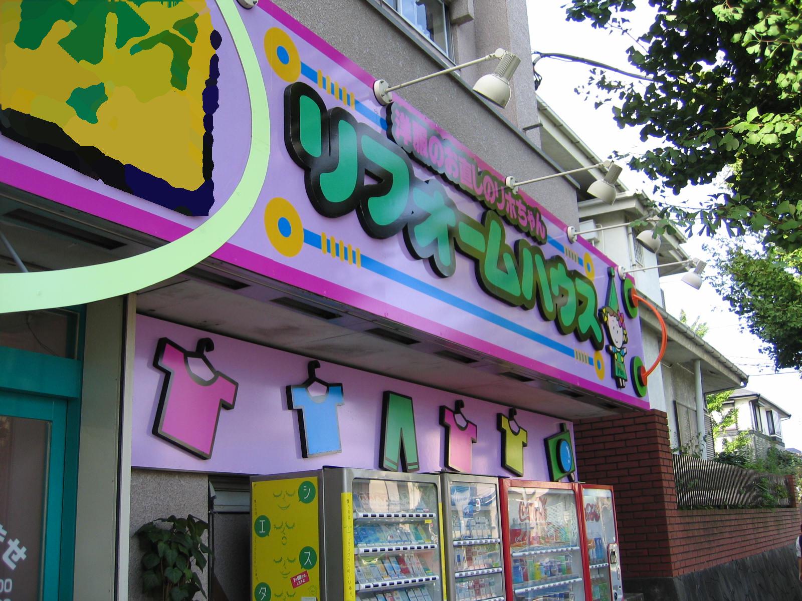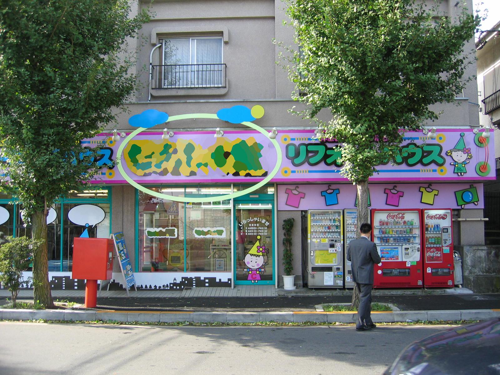 ○お店で取り扱っている、服やカメラのサービスが一目で分かる様にと、自動販売機の後ろに立体的な看板を付けました。 |