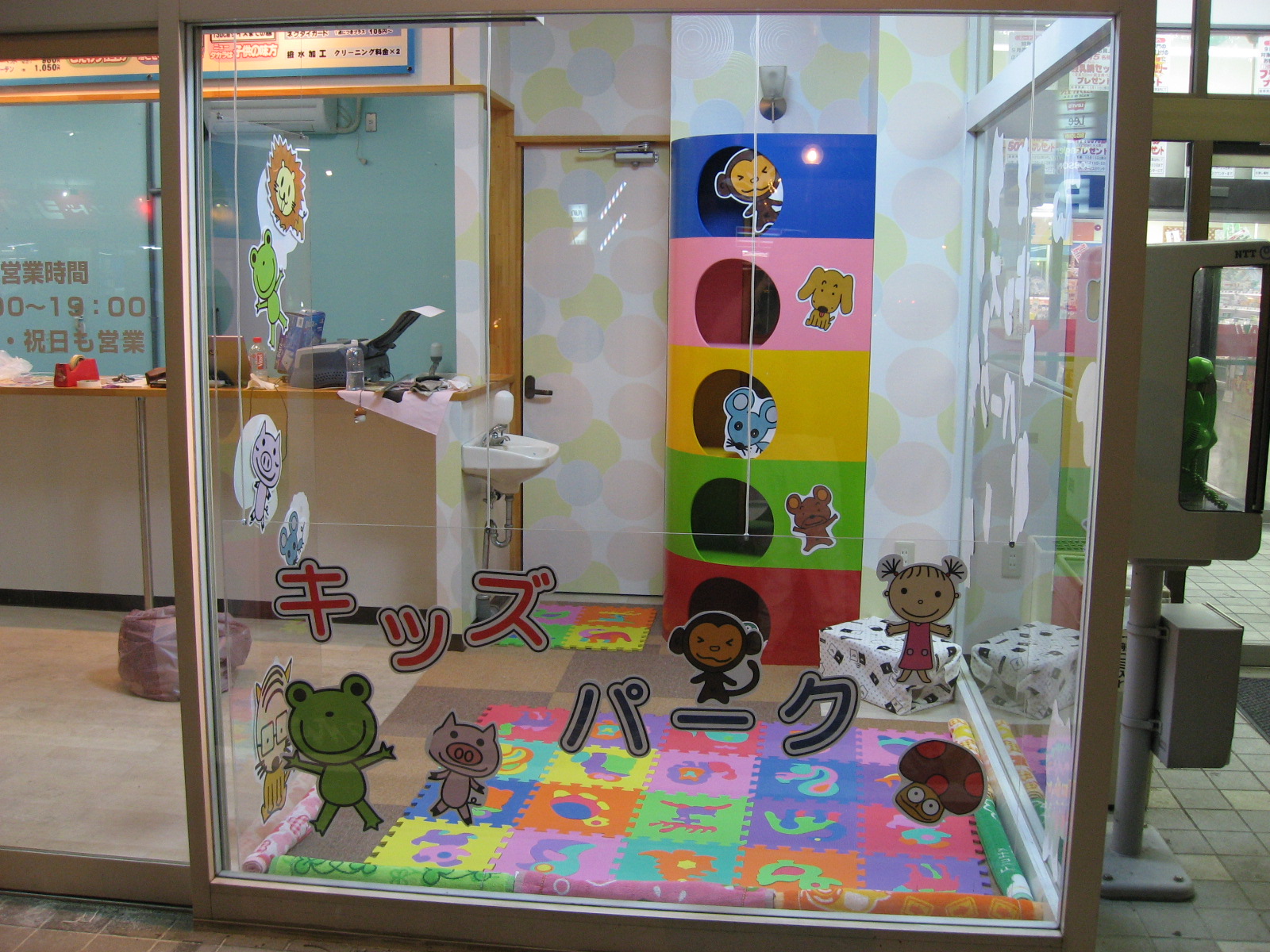 ○スーパーからもよく見え、店内からもよく見える場所にキッズコーナーを作りました。 |