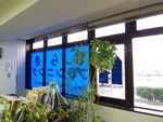 ○室内側から見た写真です。最初に白い文字シートを貼った後に、青いシートをはりました。 |