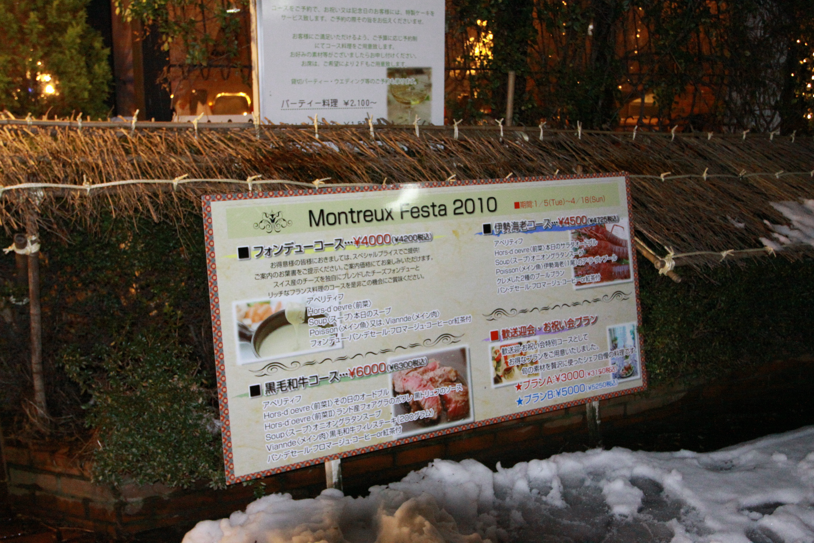○モントルー様のコース料理の看板です。舌がとろけてしまうほど美味しいですよ!!! |