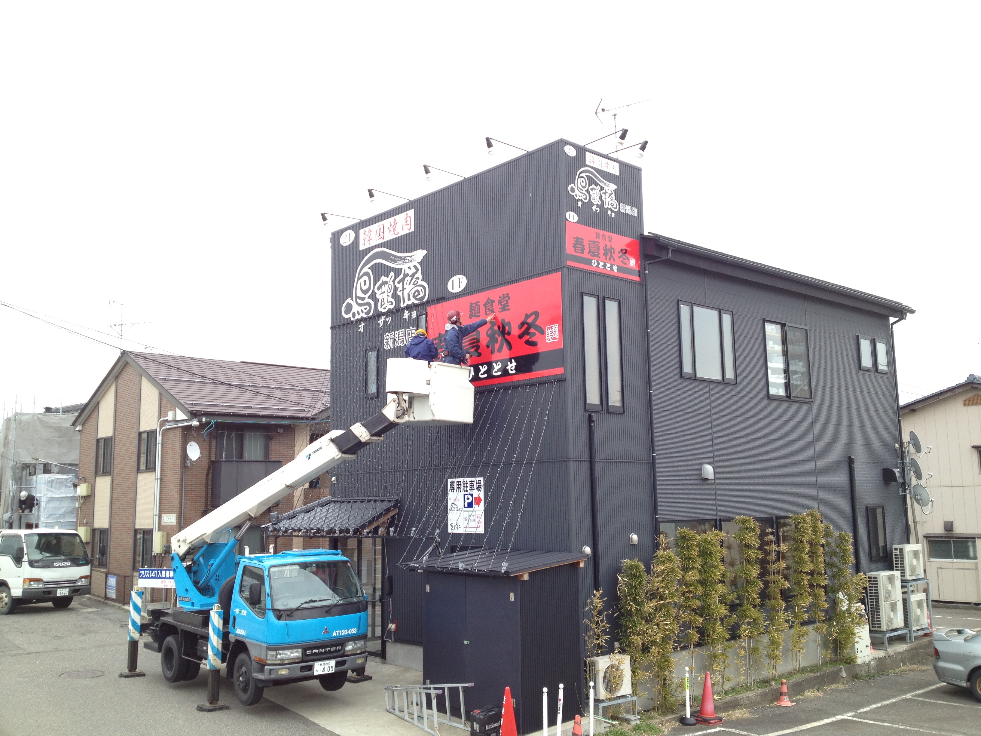 ○高所作業車で既存看板を撤去し、新規看板の取付 |