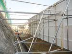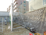 ○梯子を2つ横から掛けて、そこに足場板を通して作業。 |