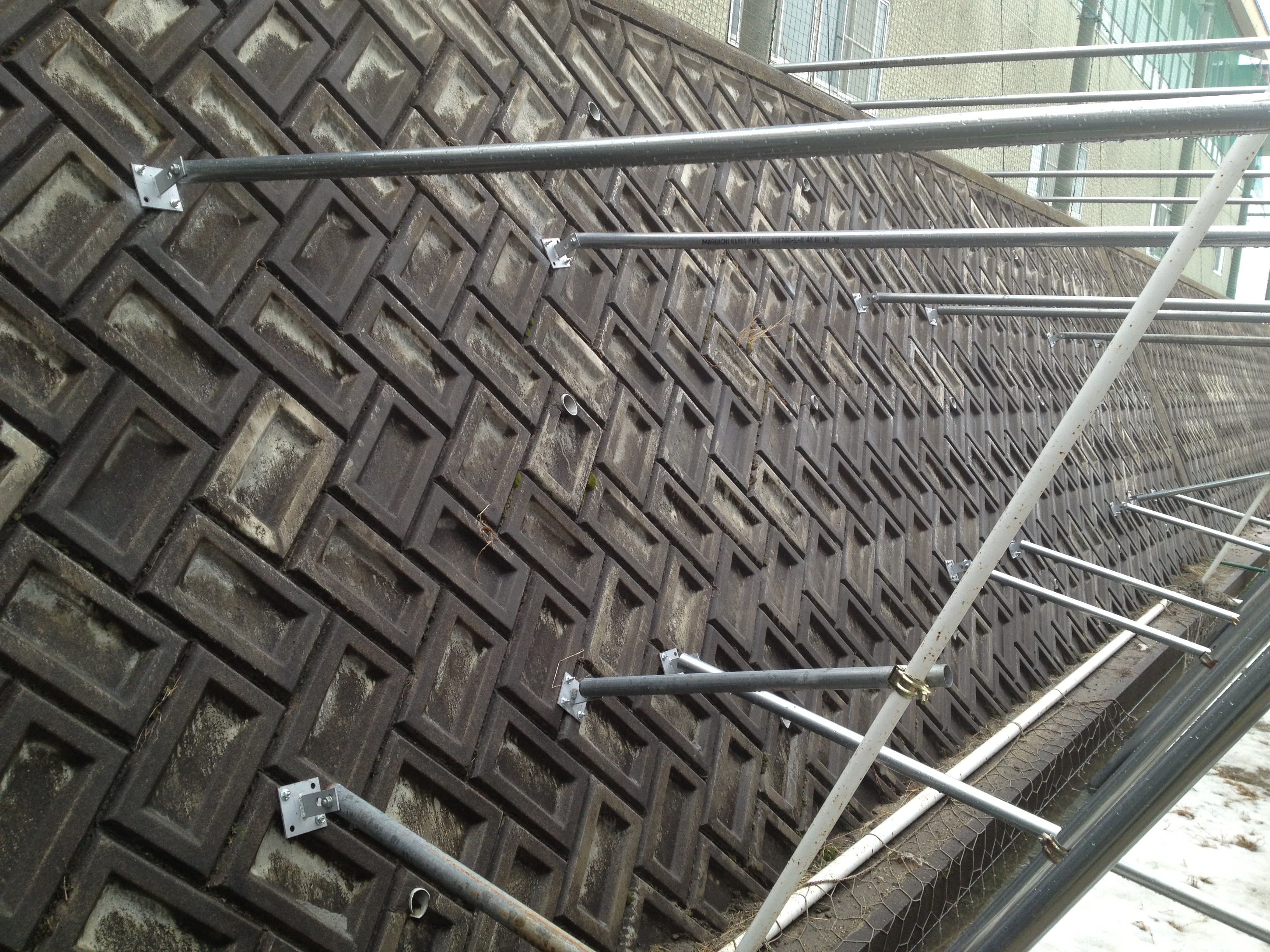 ○壁側にもアンカー止めで固定します。これだけ補強してあれば風を巻き込んでも倒れません。