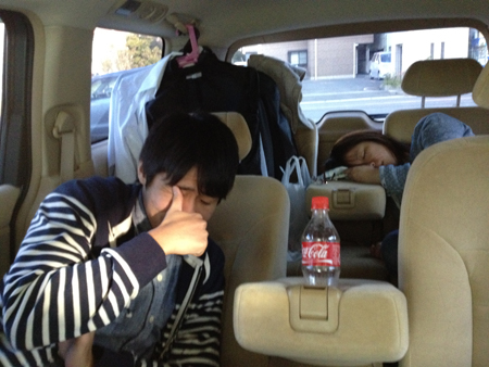大阪到着し、ローソン駐車場でしばしの仮眠をとった後の車内の様子です。