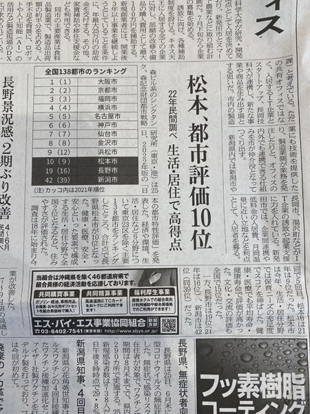 東京23区を外したとはいえ、大都市の中で目立つのがやはり10位の松本市でしょう。