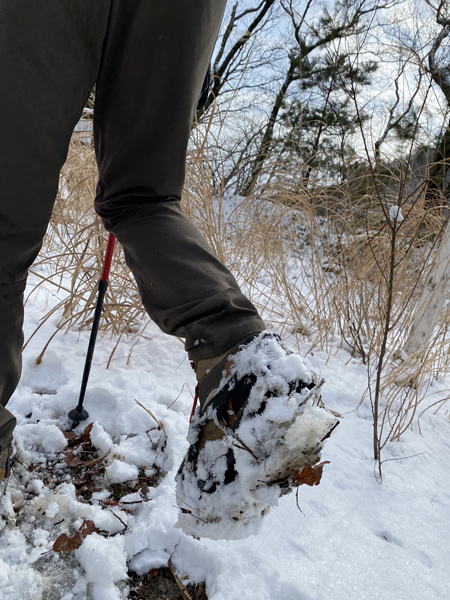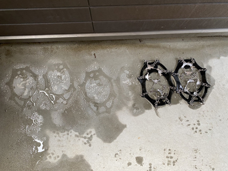 雪がチェーンスパイクの鉄にくっついて、その雪が更に雪をくっつけてどんどん背が高くなる。